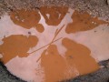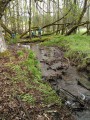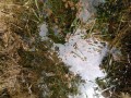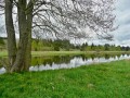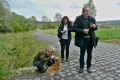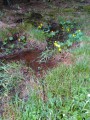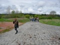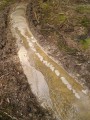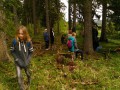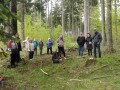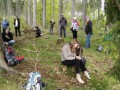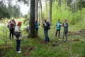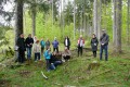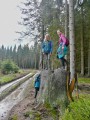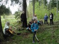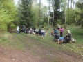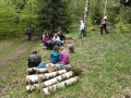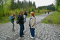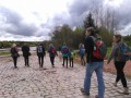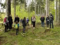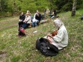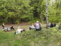 Kousek za Padrtí, ještě na otevřených pláních, jsme pak další čas věnovali připomenutí osudu této krajiny a její jedinečnosti, přírodní i kulturní, a doplnili to o vlastní plné prožití kousku přírody. Každý si vybral a provázkem dočasně orámoval libovolný metr čtvereční země, jemuž pak v usebrání, soustředěnosti či meditaci sedm minut zcela mlčky věnoval svou pozornost. Úkol byl všímat si projevů života: pohybu, organismů, barevnosti, zvuku, hloubky, změn... jak kdo chtěl. V následné reflexi zaznělo hodně inspirativních věcí a nikomu nevadilo, že se zrovna při tomto úkolu drobně rozpršelo. Cestou jsme posbírali i nějaké odpadky a vydali se dál, stezkou hodně ztíženou předchozími několikadenními dešti, které naplnily veškeré prohlubně včetně pěšinek až po okraj vodou. Ostatně bylo to trochu symbolické, protože o koloběhu vody jsme si říkali, že je jedním z oněch úžasných obrodných dějů přírody.