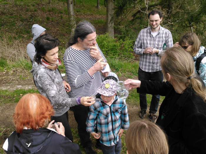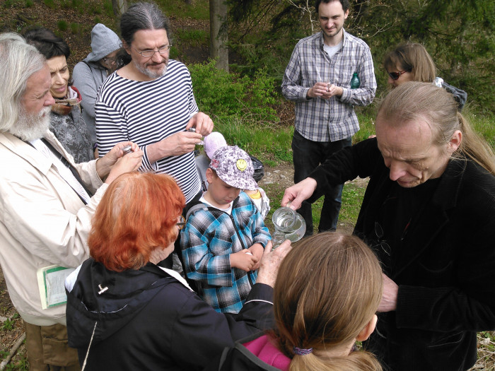 Další zastávku jsme přiřadili vodě mystické. Mladší měli za úkol najít místo, kde nám cestu zkříží potok. Tam jsme si odvyprávěli schéma rituálu, který absolvovali bojovníci jednoho přírodního kmene, když je čekal nějaký náročný úkol nebo chtěli podpořit své přátele. Pak jsme ho s těmi mladšími zkusili vykonat: spočíval v cestě mlčky proti proudu toku až k prameni, přičemž ta cesta měla být "beze zbraní" a jen s dobrými myšlenkami. Cestou měli „bojovníci“ vnímat všechnu zvěř, každého živého tvora v mysli pozdravit a popřát mu mnoho zdaru na jeho cestě. U pramene pak všichni vnořili svou ruku či ruce do vody, předali si navzájem sílu s živlem a živlu vody tím beze slov svěřili své nesobecké přání. Zpět s sebou přinesli jeden džbánek takto dotknuté vody, které Petr krásnou promluvou v kruhu nás všech požehnal, a poté nalil každému z účastníků trochu z ní do jeho malé skleničky. S tou vodou měl pak každý později naložit po svém, šetrným ohleduplným způsobem ji využít, a tím vrátit do oběhu: třeba zalít si doma květinu a podobně. Vědci spočítali, že z jediné kapky vody, je-li předána volně přírodě, se molekuly rovnoměrně rozptýlí po planetě za pouhé čtyři měsíce. Za čtyři měsíce se tedy stanou součástí každého mraku, každé vodní plochy a každého živého tvora. A je-li pravda, že si ty „naše“ stále nesou rituálem předanou informaci, vytvářejí se síly pro nás neznatelné a těžko pochopitelné. Nám stačí uvědomit si na tomto příkladu, jak jsme neustále vzájemně provázáni a ovlivňováni.