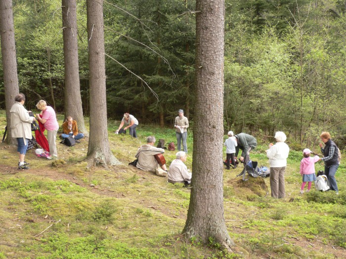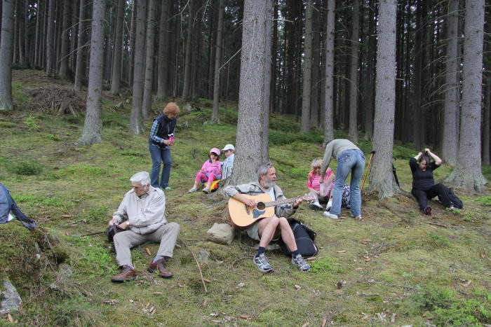 Svou cestu jsme oficiálně začali pod obrovským javorem u mlýna nedaleko vesničky Mýto. Ten strom byl díky dostatku prostoru nádherně pravidelně rostlý a tak starý a majestátný, že se v rozvětvení jeho koruny ještě dokázal usadit a pohodlně vyrůst docela hezký jeřáb. Od té chvíle nás vlastně po celou několikakilometrovou cestu do Tachova stromy neopustily. Pokračovali jsme Aglaiiným údolím podél řeky (zde teprve říčky) Mže měkkými cestičkami vedoucími vzrostlým smrkovým lesem, kde už nádherně vonělo borůvčí a smola a protékaly jarní pramínky. Není divu, že nás to zlákalo k neplánované krátké zastávce. Na pařezech a lesní trávě někteří posvačili, jiní jen tak rozjímali. Vzhledem k tomu, že se vždy najde člověk ochotný nést celou cestu kytaru, došlo i na tradiční hudební obohacení.