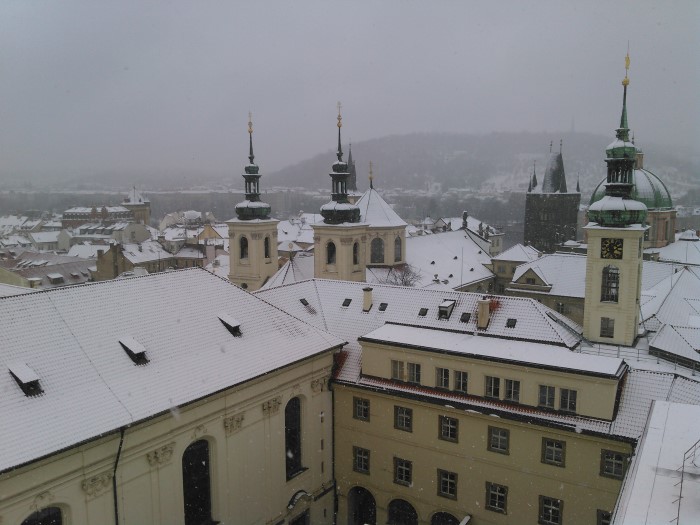 To ale nebyla jediná položka v našem programu. Sraz jsme měli už po desáté dopoledne, abychom stihli prohlídku Klementina, zejména barokní knihovny a Astronomické věže, která šamany zajímá kvůli tomu, že se zde prováděla úplně první kontinuální vědecká meteorologická pozorování v českých zemích. Ten den nasněžilo, a to i v Praze, a i při výstupu na věž chumelilo, což vytvořilo kouzelnou sváteční atmosféru nad Starým městem. Potom jsme si rychle udělali oběd a už se věnovali jen nácviku na odpolední Sdílení a přípravám na provoz "kavárny". V nabídce byly čtyři základní druhy sirupů: šípkový, aroniový, meduňkový a mátový, a pak jejich kombinace. Perníčků jsmě měli přes padesát balení cca po šesti kouscích. Mládež měla na starosti také vítání a zásobování všech hostů ručně tištěným programem.