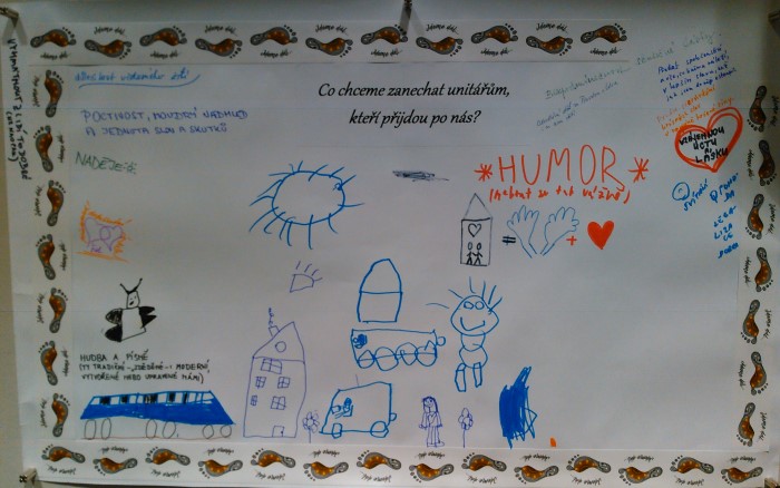Pomalu nás doplňovaly i další přicházející děti z jiných obcí a nakonec to byla moc hezká skupina dvanácti zástupců nejmladší unitářské generace! Hned na úvod slavnosti se ujali světelného doprovodu příběhu o Prométheovi, a pak ještě asistovali u svíček radostí a strastí. Také skvěle vystihli, co chceme předat unitářům, kteří přijdou po nás - ti, co ještě neumí psát, své nápady malovali. Větší pak ještě vyprávěli závěrečný příběh o daru světla.