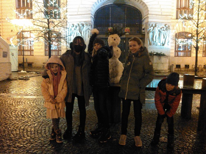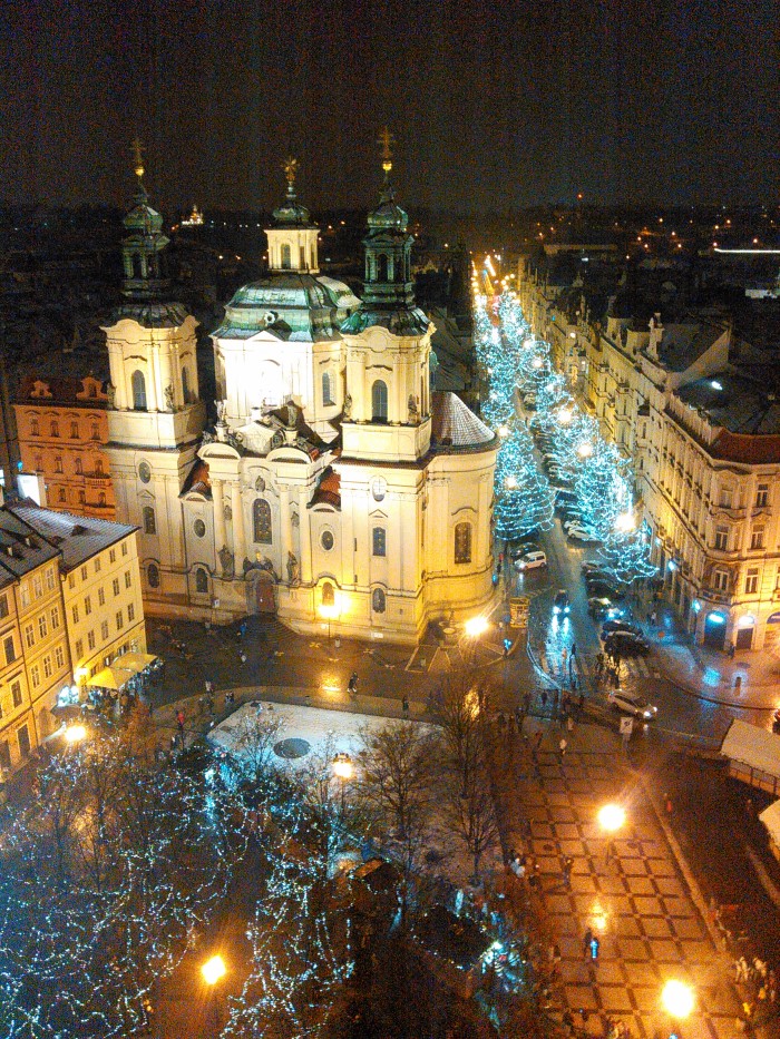 Ale ani tím náš program nekončil. Po rychlé večeři (připravili jsme si párky v rohlíku) jsme se ještě spolu s Alicornou a Janou vypravili na další pražskou věž, tentokrát Staroměstské radnice. Ti unavenější použili výtah, někteří ale ještě měli dost sil s ním na nahoru věž závodit po schodech. Z ochozu se nám otevřel úchvatný pohled na rozsvícenou převánoční Prahu. Cestou zpět do Unitarie jsme se zastavili u stromku na Staroměstském náměstí a také potkali prvního skutečného letošního sněhuláka! Okolo půl desáté jsme se vrátili na základnu v Karlovce a ještě zahráli jednu vánoční hru a rozdali si inspirativní soupis zhruba deseti věcí, které můžeme každý sám pro sebe nebo pro druhé udělat, abychom ještě umocniti prožitek zimních svátečních dnů. Poslední z nabídnutých úkolů zněl "Jeden večer na půl hodiny vypnout všechna světla a přístroje, jako mobil a televizi, a užít si zimní šero jen třeba se svíčkou nebo olejovou lampou… sám nebo s někým, koho mám rád."