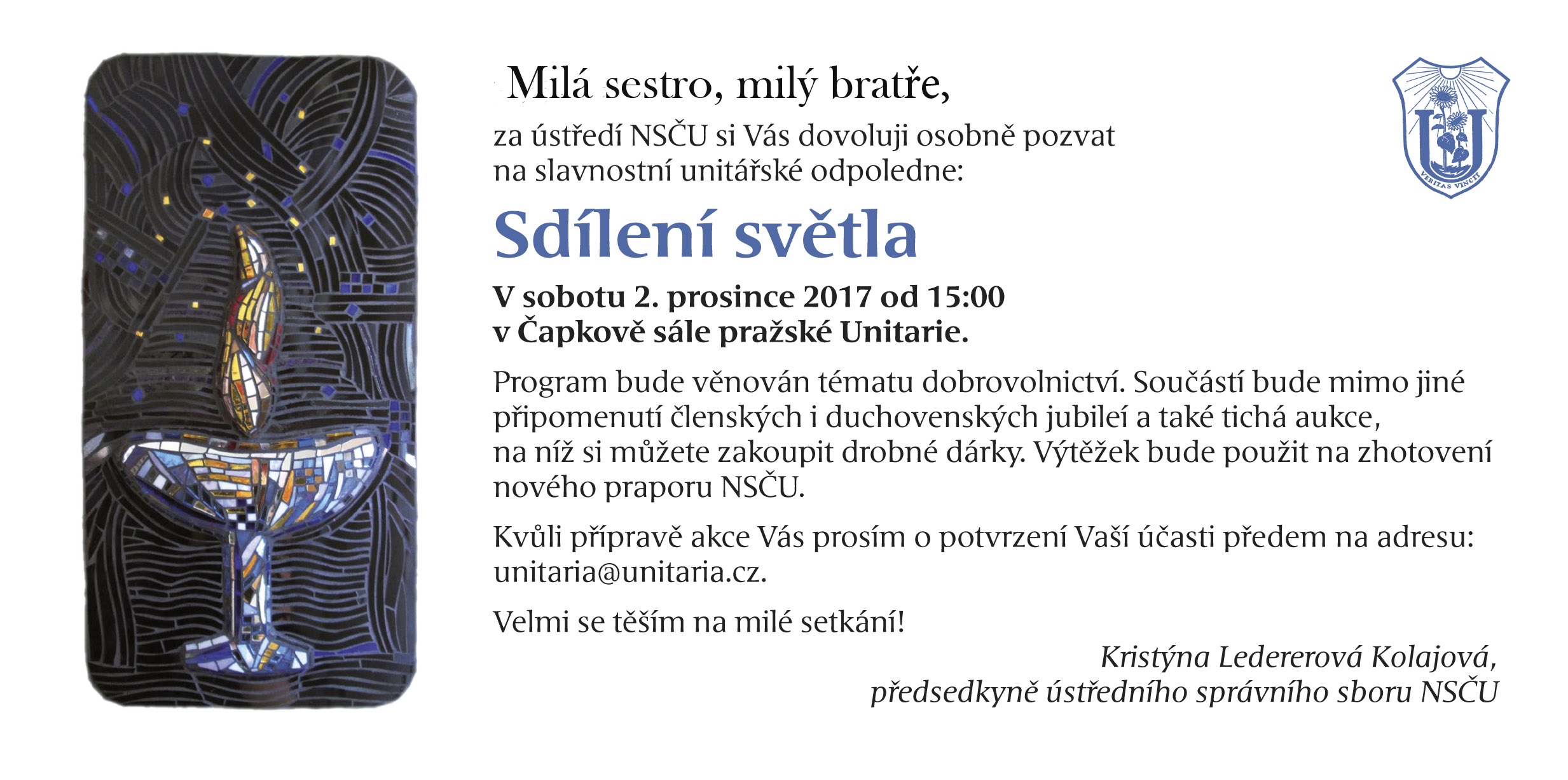 Slavnostní večer věnovaný každému z členů NSČU. Slavnost Sdílení světla se bude konat od 16:00 v Čapkově sále pražské Unitarie.