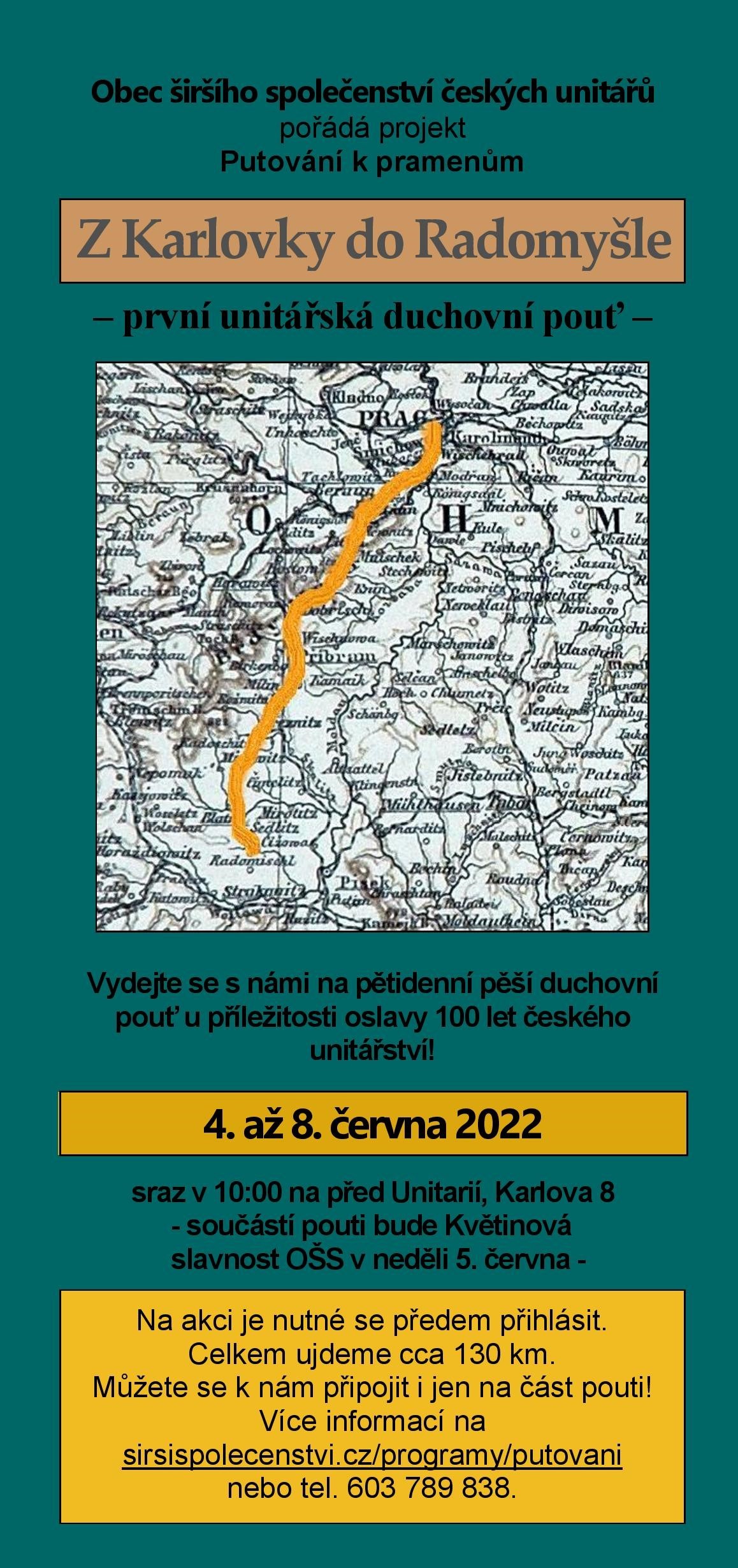 Pětidenní pěší duchovní pouť u příležitosti oslavy sto let českého unitářství! Je to první událost tohoto druhu v našich dějinách a unikátní příležitost projít velmi symbolickou trasu, značící náš vztah vlastním kořenům, a to při výročí 100. let od jeho vzniku, a také uctění odkazu Norberta Fabiana Čapka.